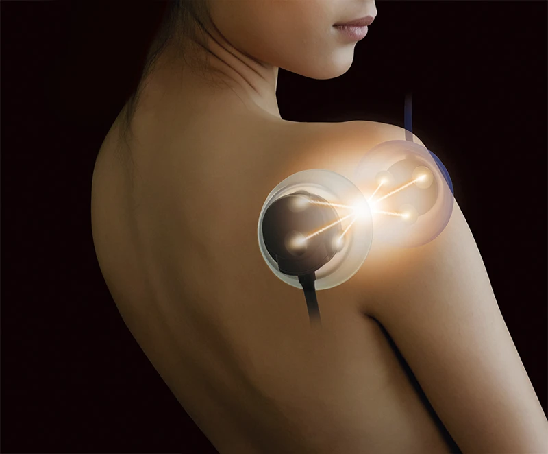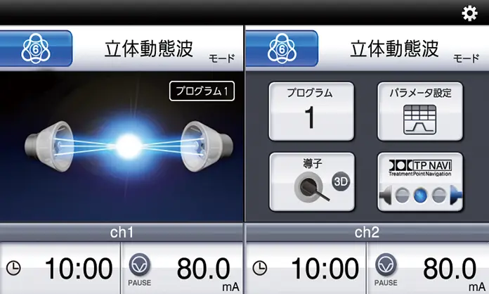 微弱な電流を流すことで傷ついた組織の修復を早め、損傷部の治癒を促進するマイクロカレント療法を立体的に行います。立体動態波モードの1/1000という極めて弱い電流のため、ほとんど刺激がなく、神経や筋を興奮させません。MCRモードよりも深い部位への治療が可能です。