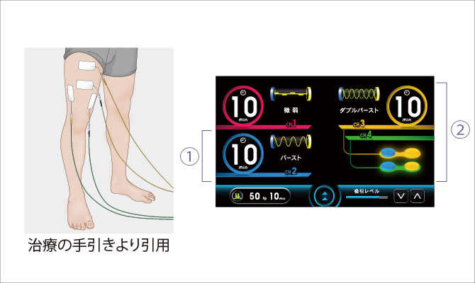 CH1,2はセッティング時の画面表示。CH3,4は治療中の画面表示。