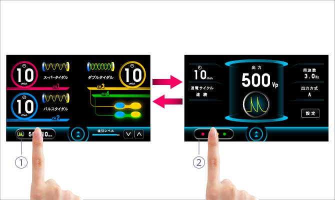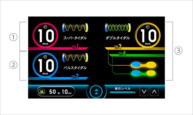 中周波領域を用いて独自に開発した「スーパータイダル」、心地よい刺激の中にたたくような強い刺激感のある「パルスタイダル」、さらに「ダブルタイダル」「クアッドタイダル」も治療部位に合わせて選択可能です。