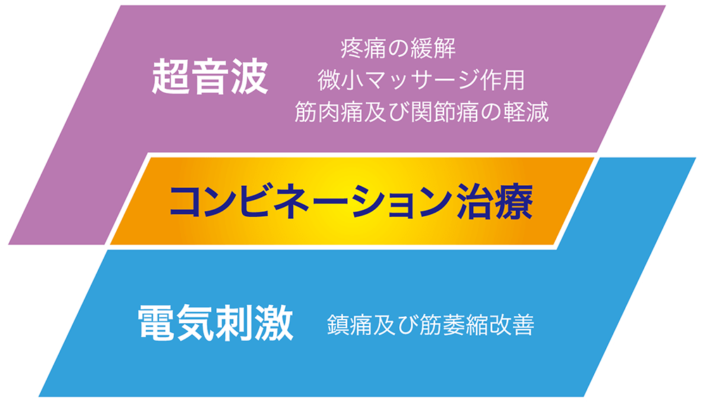 超音波と電気刺激を組み合わせたコンビネーション治療が可能です。疾患部に対し2つの刺激が働きかけることで、治療の幅が広がり、効率も高めます。