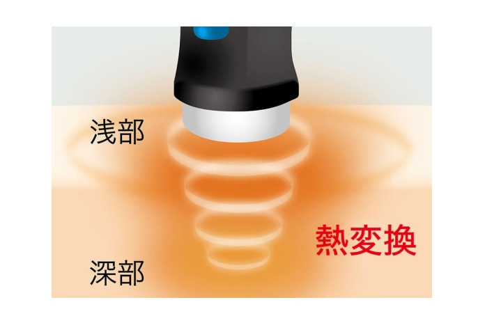 1つのプローブで1MHzと3MHz対応。プローブの中の結晶体を伸縮させることで「逆圧電効果」による音波を発生。1秒間に100万回(1MHz)または300万回(3MHz)の高速度ミクロマッサージで、深部または浅部に直接刺激を与えます。また超音波が生体組織に照射される際に生じる熱で、温熱作用を発生。超音波が到達している範囲を立体的に温めます。