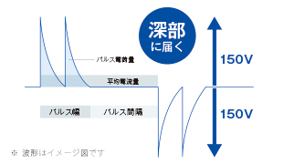 瞬間的に高電圧の電流を流すことで、皮膚抵抗を最小限に抑え、刺激感の少ない深部到達を可能にしたHi-Voltage(ハイボルテージ)電流刺激療法。
