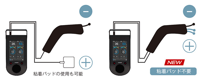 電極を複数差した場合、1本が粘着パッドの役割を果たすため、粘着パッドを使わずに通電することができます。