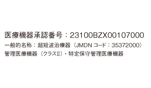 日本国内においてその周波数帯により超短波領域(RF波帯域:13MHz~27.12MHz)の医療機器として、厚生労働省所管の独立行政法人※による承認を得ています。