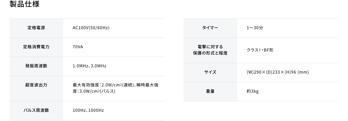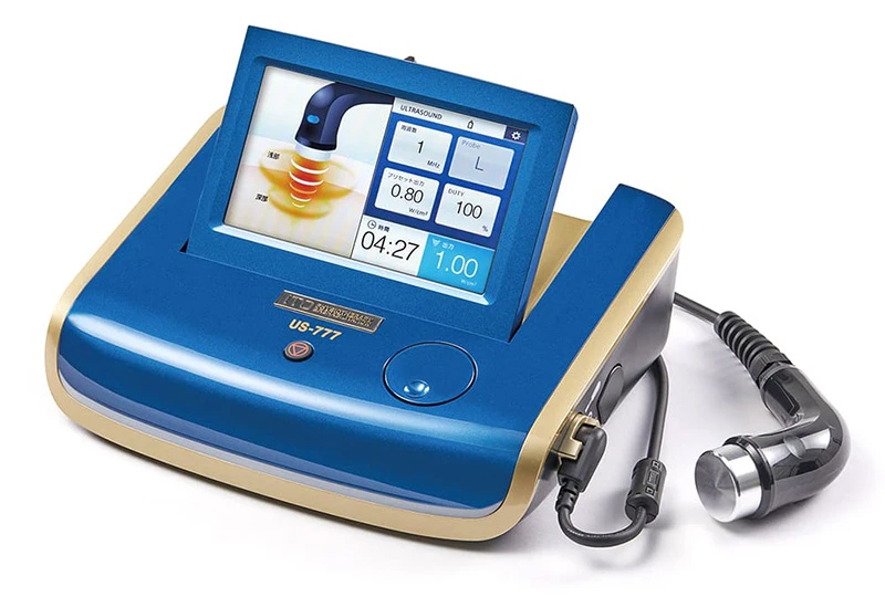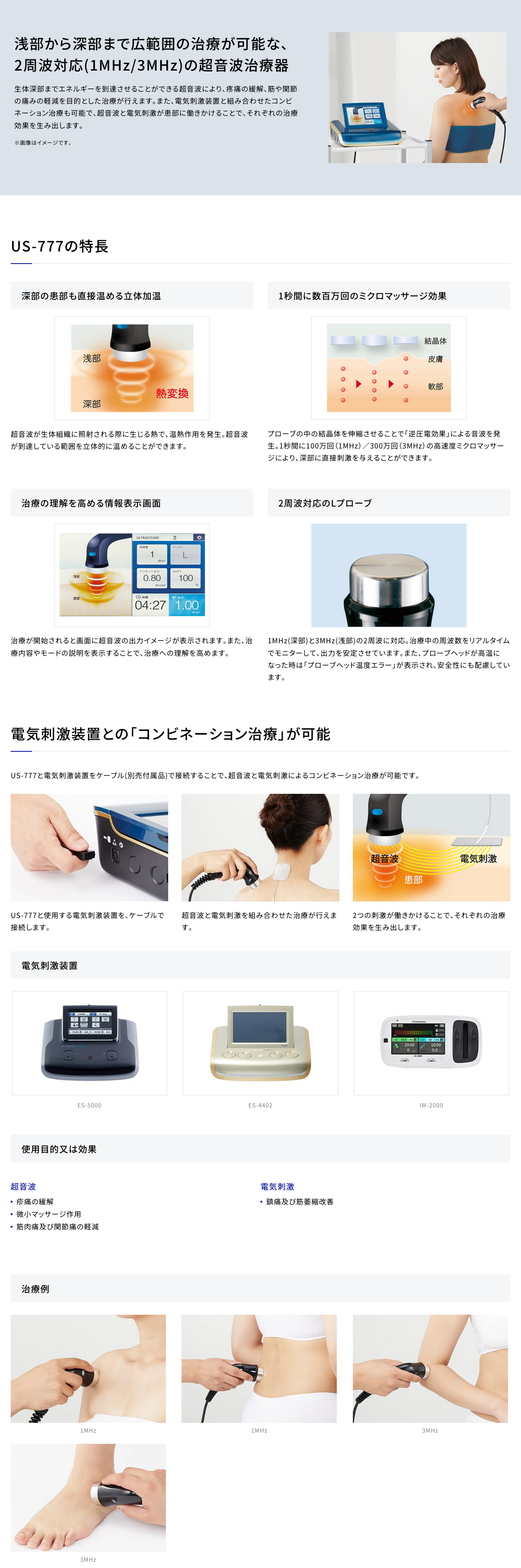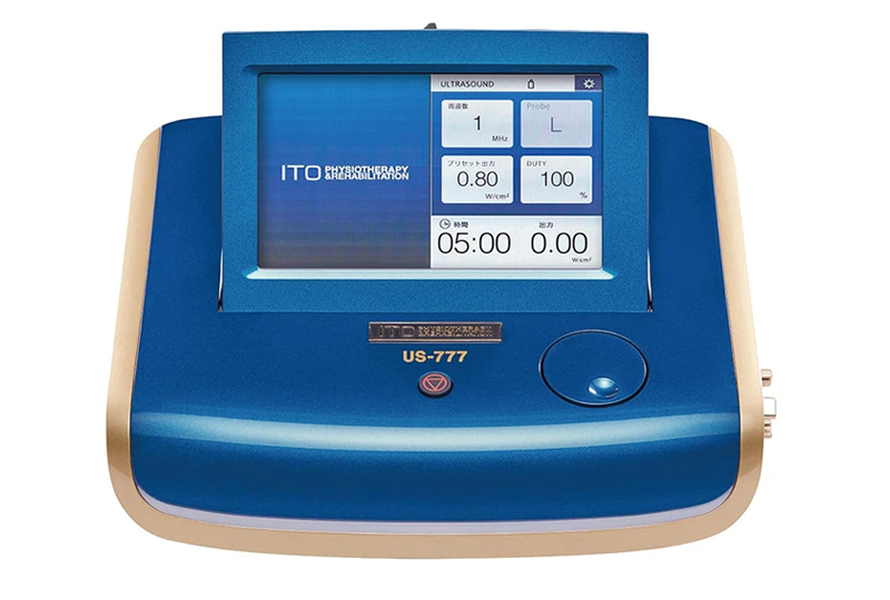 浅部から深部まで広範囲の治療が可能な、2周波対応(1MHz/3MHz)の超音波治療器。電気刺激装置とのコンビネーション治療も可能。