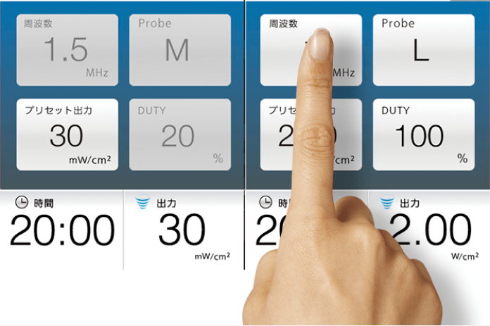 1.5MHz(深部・中間部)のプローブを標準装備し、3MHz(浅部)のプローブをオプションでご用意しています。治療部位や目的に応じて、3段階の出力切替(30mW/cm²、45mW/cm²、60mW/cm²)と組み合わせることで、浅部から深部まで様々な患部の治療に対応します。