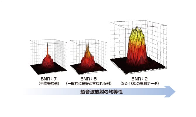 不均等なプローブで治療すると局所的に強い超音波が放射され、生体組織を損傷するおそれがあります。一般的にBNR(ビーム不均等率)5.0以下で良好と言われる中、SZ-100のプローブのBNRはすべて2.9以下を実現しました。均等な超音波放射により、安定的に治療できます。
