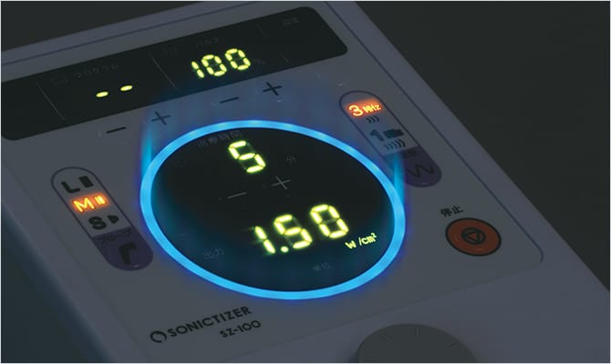 SZ-100は、1MHzと3MHzの超音波治療が可能です。2つの周波数は専用キーで簡単に切り替えることができます。