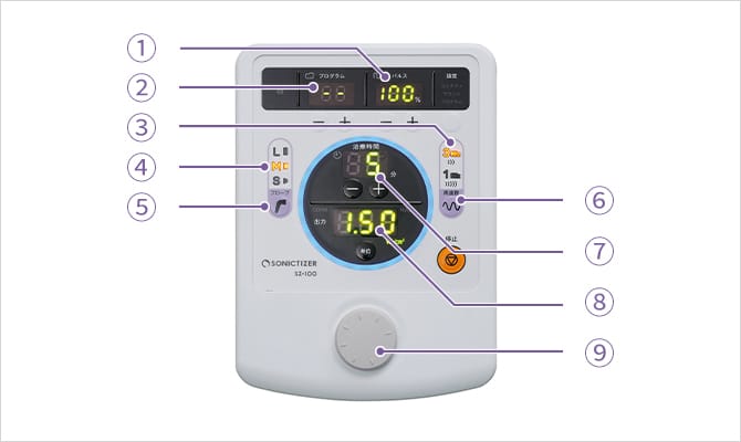 1.パルス表示器 2.プログラム表示器 3.音響作用周波数表示器 4.プローブ選択表示器 5.プローブ選択キー 6.音響作用周波数選択キー 7.治療時間表示器 8.出力表示器 9.出力ツマミ