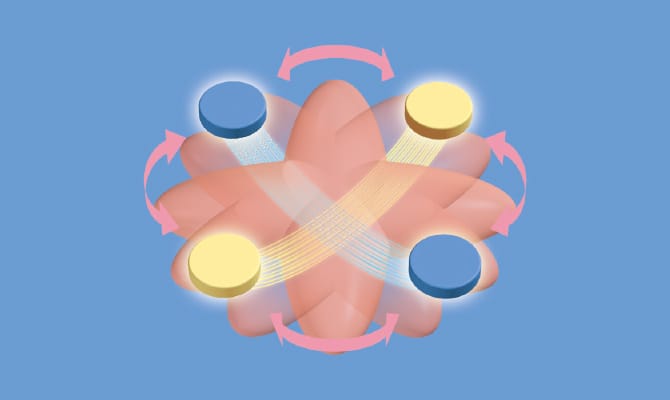 2つの異なる治療波で変調した波形を、青、黄それぞれの導子から体内へ流します。2種類の刺激感覚によって、新しい第3の刺激感が得られるモードです。