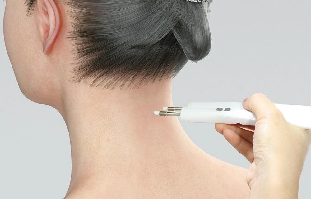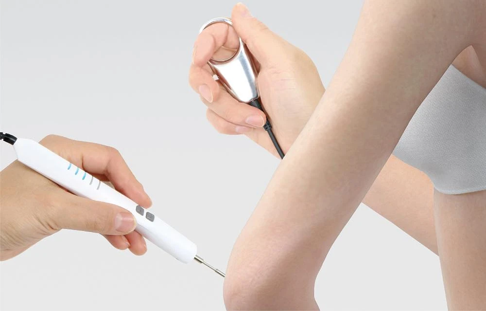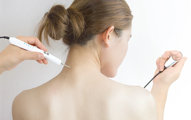 -極のプローブで、微弱電流を通電し、皮膚抵抗が高い治療ポイントを探します。
