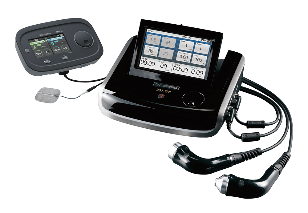 IM-2000と超音波治療器をコンビネーションケーブルで接続することで、マイクロカレントと超音波を組み合わせたコンビネーション治療が行えます。疾患部に対して2つの刺激を同時に与えることで、それぞれの治療効果を生み出します。※MCRモードのみで使用が可能です。
