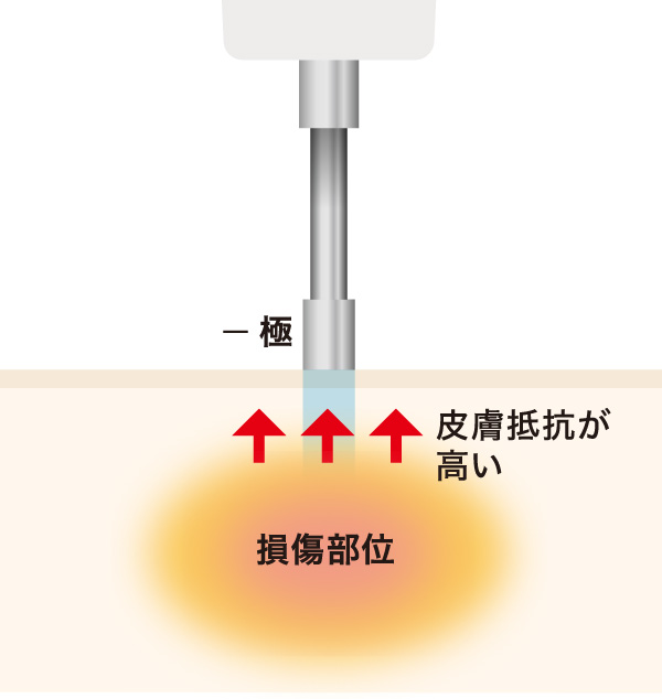 中周波帯の微弱電流を通電して、実際に体に流れた電流量を計測することで、皮膚インピーダンスを測定します。患部の状態を確認しながら、治療ポイントに対して的確なアプローチが行えます。生体に流れる損傷電流に似た微弱な電流が、損傷部位の治癒を促進します。