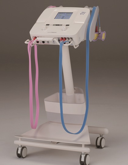 リハビリテーション室から病棟へと様々な医療現場で使用していただくため、電源コードやチューブをパイプ内へ収納、電極コードの床への垂れ下がり防止、専用架台のハンドリングの向上など、従来治療器より更に可搬性の機能を見直し、高いユーザビリティを実現しました。
