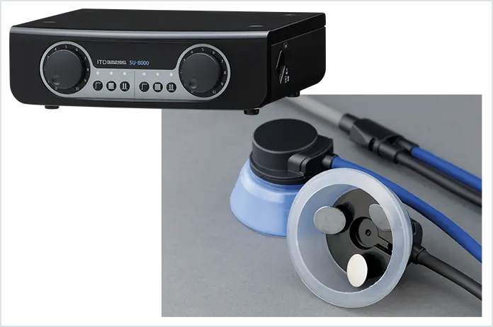 吸引装置は、連続/間欠(FAST)/間欠(SLOW)の3種類の治療モードを搭載。間欠は3Dリリースプローブに対応したリズムを採用し、目的に応じてモードの選択が可能です。6極吸引導子は、吐き出しタイプの吸引のため、皮膚への吸引痕が残りにくく、水受けも不要です。