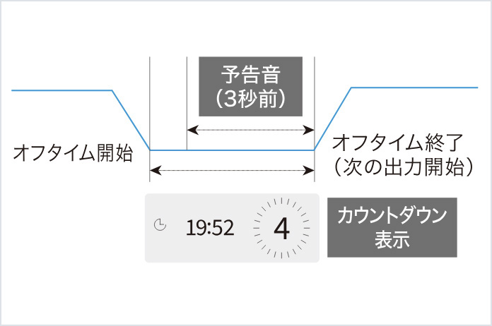 予告音を設定すると、オフタイムが終了する3秒前から予告音が鳴ります。また、オフタイムを3秒以上に設定するとオフタイムの残り時間がカウントダウン表示されます。