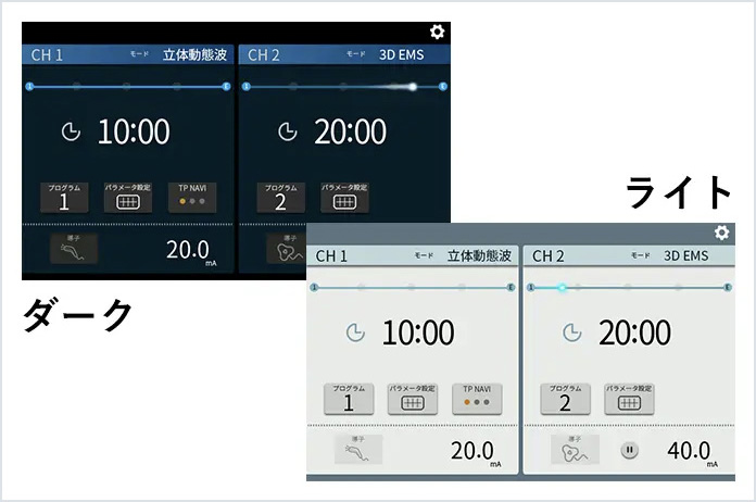 視認性を高めるシンプルなデザインのタッチパネルは、ライトまたはダークのカラー選択が可能です。直感的に操作できる画面表示で、出力フェーズも一目で確認することができます。