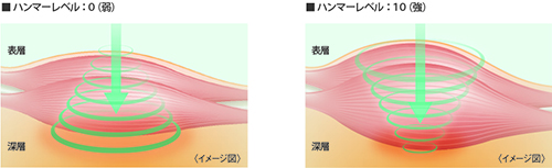 ハンマーとは、低周波の出力に瞬間的な電圧上昇を加えて叩くような刺激を与えるものです。ハンマーの強さを0~10の範囲で選択することができます。ハンマーレベルが強いほど、より大きな筋収縮を促します。