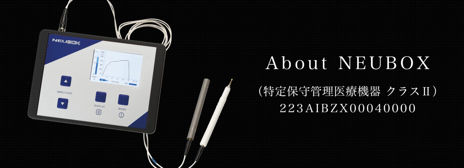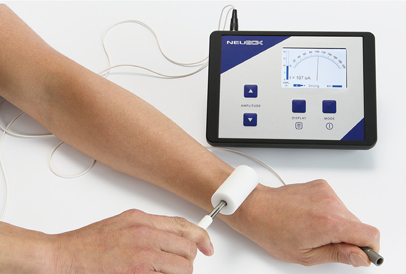 微弱電流治療器ニューボックスは、生体電流に近い微弱電流(約100〜200μA)を2000〜4000Hzの周波数で通電します。患部へ経皮的に通電することにより、数秒間で神経及び筋組織に影響を与え、効果的に鎮痛及び筋萎縮改善が期待できます。