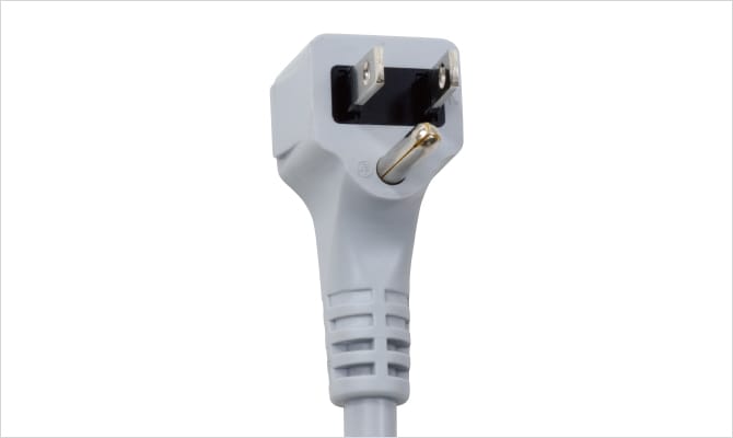 コンセントの接触不良によるトラッキング現象、感電、漏電といったトラブルを回避するために、L 型3 Pプラグを採用しました。(壁側コンセントには接地型コンセントを推奨しています。)