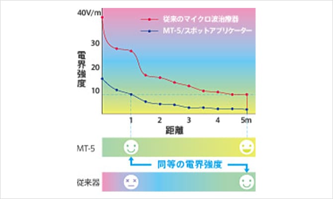 ※同じ出力(80W)で非接触型の当社従来器MT-3(左)と比較した場合、MT-5(右)は加温効果が高く、約2倍の温感が得られます。すなわち、従来器の半分の電力で同じ治療効果をあげることができます。