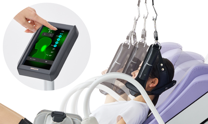 頸椎牽引では、牽引の方向と上半身の角度に応じて、力が作用する部位が上位~下位頸椎と変化します。シートの傾きをコントロールし、この角度を変化させる機構を搭載しています。