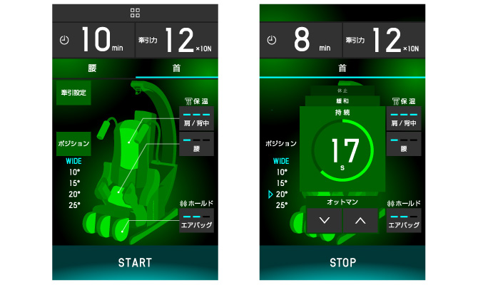 | 手元停止スイッチ 脚保持機能(エアバッグ) 背マットの冷感緩和機能 腰マットの冷感緩和機能 腰ベルトの自動巻取り機能 休止牽引力の設定機能 牽引力の上限値設定機能 ゆるやかモードの設定機能 ステップモードの設定機能 サイクル牽引モードの設定機能 頸椎牽引ポジションの設定機能 |