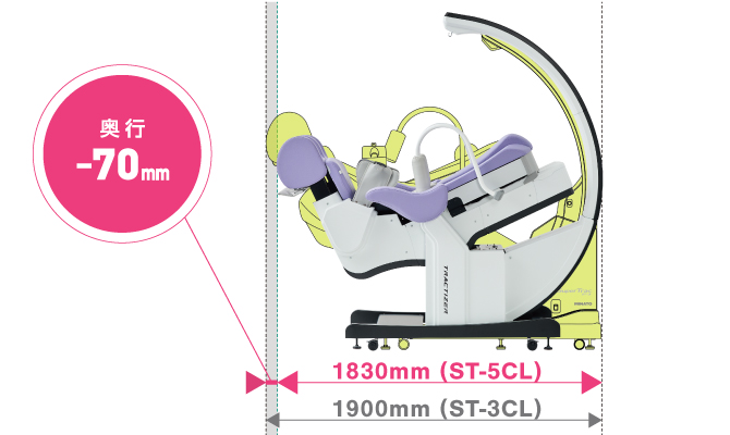 従来機と比較し、奥行を70mm縮めました。これにより、通路幅を広く取ることができ、院内のスムーズな動線確保に貢献します。