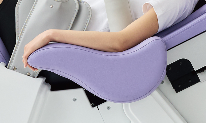 腕が位置ずれしにくいように肘置き後方部分の形状を盛り上げました。また、肘置きの先端に指先がかかるため、治療時に安心感が生まれます。