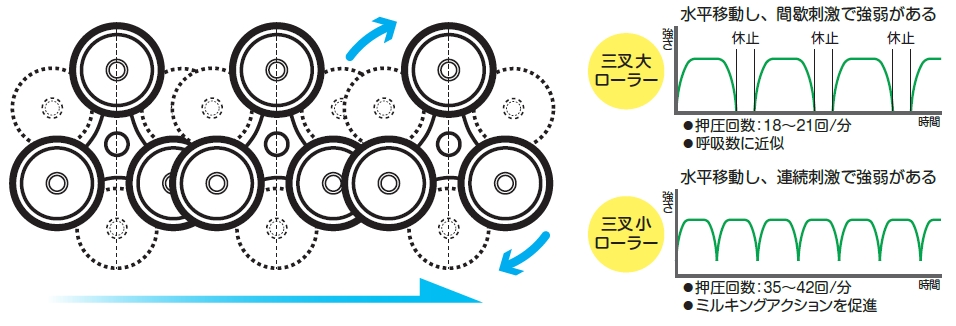 「押す」「揉む」「伸ばす」「振せん」等の機能を組合せ、