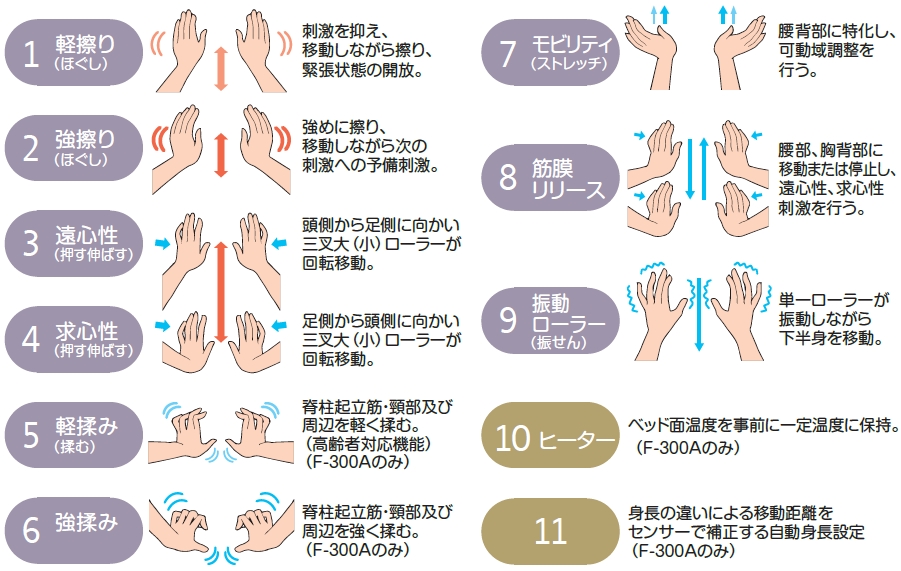 F-300Aは身長の違いによる刺激部位のズレを自動で補正するセンサーを装備しており、個別対応機能が充実しています。