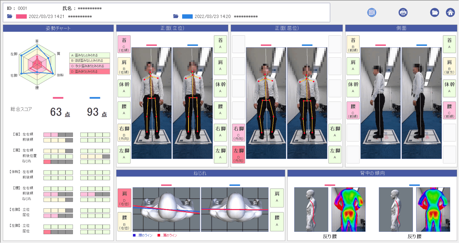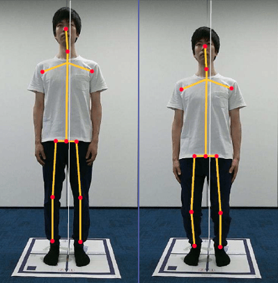| 全14指標 首の傾き(左右)、肩の傾き(左右)、腰の傾き(左右)、体幹の傾き(左右)、右膝関節角(立位)、左膝関節角(立位)、右膝関節角(屈位)、左膝関節角(屈位)、肩前後位置、首の傾き(前後)、体幹の傾き(前後)、腰の傾き(前後)、肩のねじれ、骨盤のねじれ |