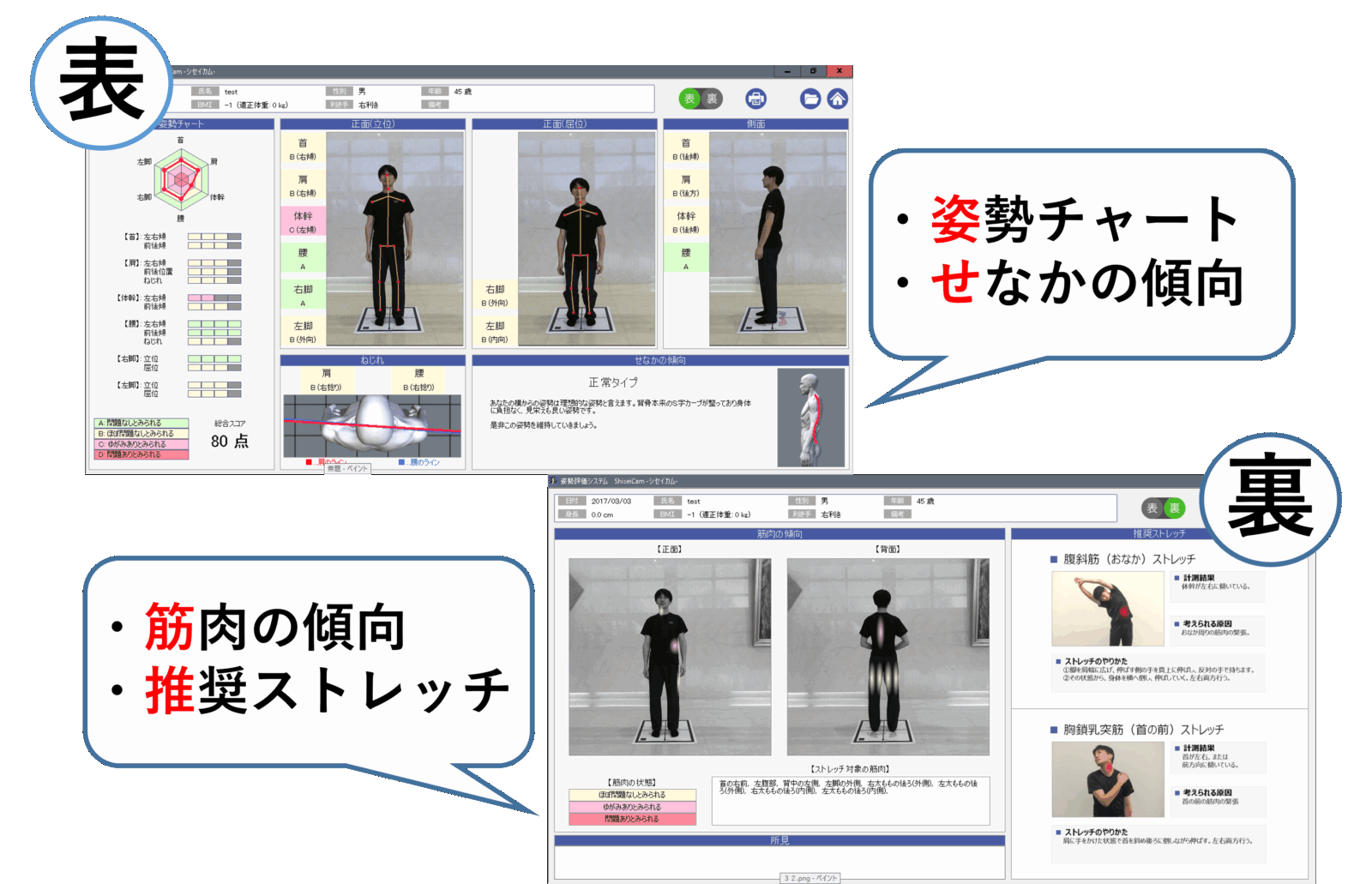 撮影後、すぐにシンプルで分かり易い結果レポートを出力。レポートには、お勧めのストレッチも掲載されます。