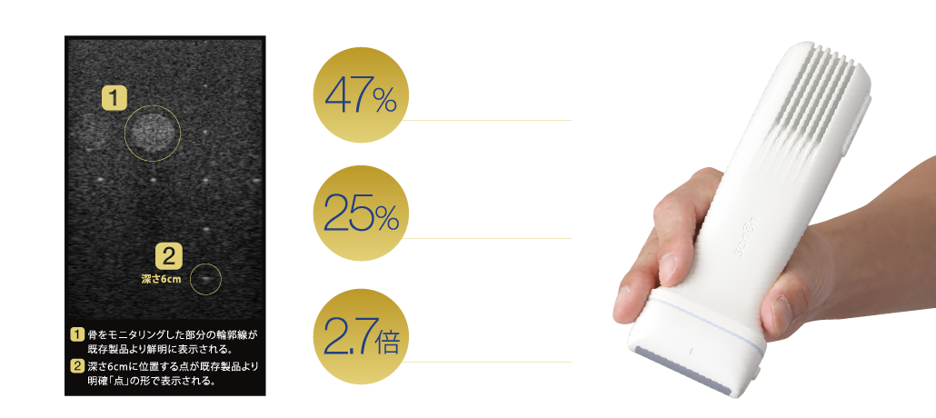 プローブとモバイル機器のみで使用できるため携帯性に優れ、院外へ持ち出しての検査を強力にサポート。SONON500Lは従来製品(300L)と比べ、体積47%減、重さ25%減と、更なる小型・軽量化を実現。更に画質も向上。従来の1次元ビームフォーミングから、2次元ビームフォーミングに拡張した次世代超音波エンジンVSE™を実現。さらに、有効チャンネル数も24chから64chに大幅増。ソフト・ハード両面から画質向上を実現しました。