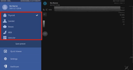 SONONは、「いつでも、どこでも、簡単に」を実現させるために、とことんユーザーインターフェース(UI)にこだわりました。よく使う機能を常に表示し、極力ボタン操作を少なくできるよう設計。直感的な操作で「見る」「撮る」「測る」「保存する」「呼び出す」ことができ、診療科に適した各種設定をプリセットしているため、エコー初心者でも簡単に使用できる操作性を実現しました。