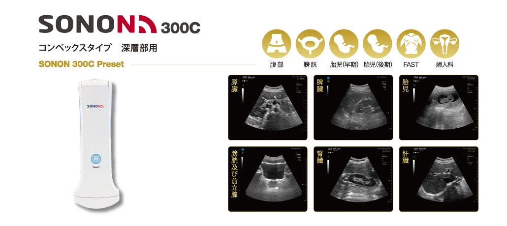 世界中でますます広がるPOCUS(Point of Care Ultrasound)の重要性から、携帯性・機動性・操作性を追求したのが、超音波画像診断装置SONON装置本体をプローブに詰め込み、プローブに内蔵されたWi-Fiを使用してモバイル端末(PC、タブレット、スマートフォン)と無線接続。